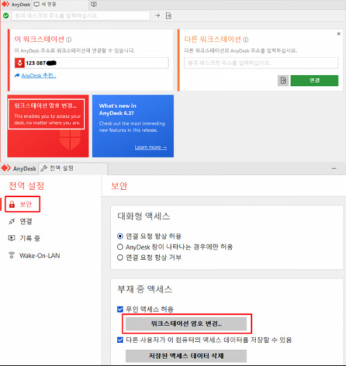 애니데스크 사용시 비멀번호를 변경하고 싶으시면 아래 그림 빨간색 부분 클릭하시면 됩니다.